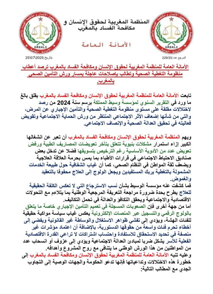 تابعت الأمانة العامة للمنظمة المغربية لحقوق الإنسان ومكافحة الفساد بالمغرب بقلق بالغ ما ورد في التقرير السنوي لمؤسسة وسيط المملكة برسم سنة 2024 من رصد لاختلالات مقلقة على مستوى منظومة التغطية الصحية والتأمين الإجباري عن المرض، والتي من شأنها إضعاف الأثر الاجتماعي المنتظر من ورش الحماية الاجتماعية وتقويض فعاليته في تحقيق العدالة الصحية والإنصاف الاجتماعي.
