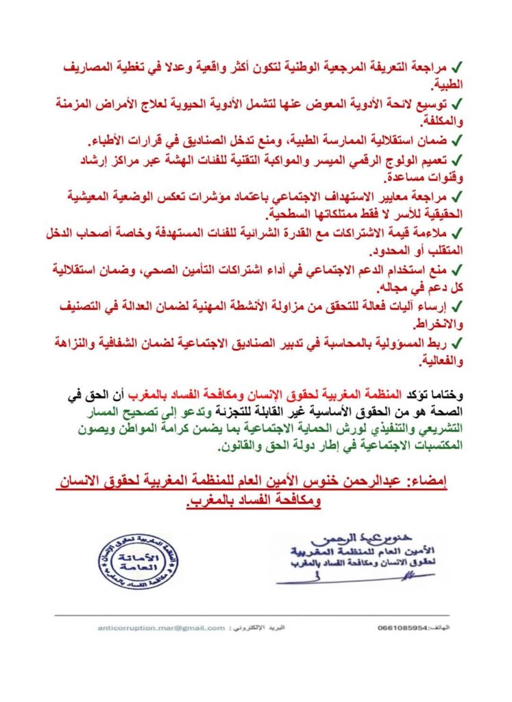 وختاما تؤكد المنظمة المغربية لحقوق الإنسان ومكافحة الفساد بالمغرب أن الحق في الصحة هو من الحقوق الأساسية غير القابلة للتجزيء وتدعو إلى تصحيح المسار التشريعي والتنفيذي لورش الحماية الاجتماعية بما يضمن كرامة المواطن ويصون المكتسبات الاجتماعية في إطار دولة الحق والقانون.