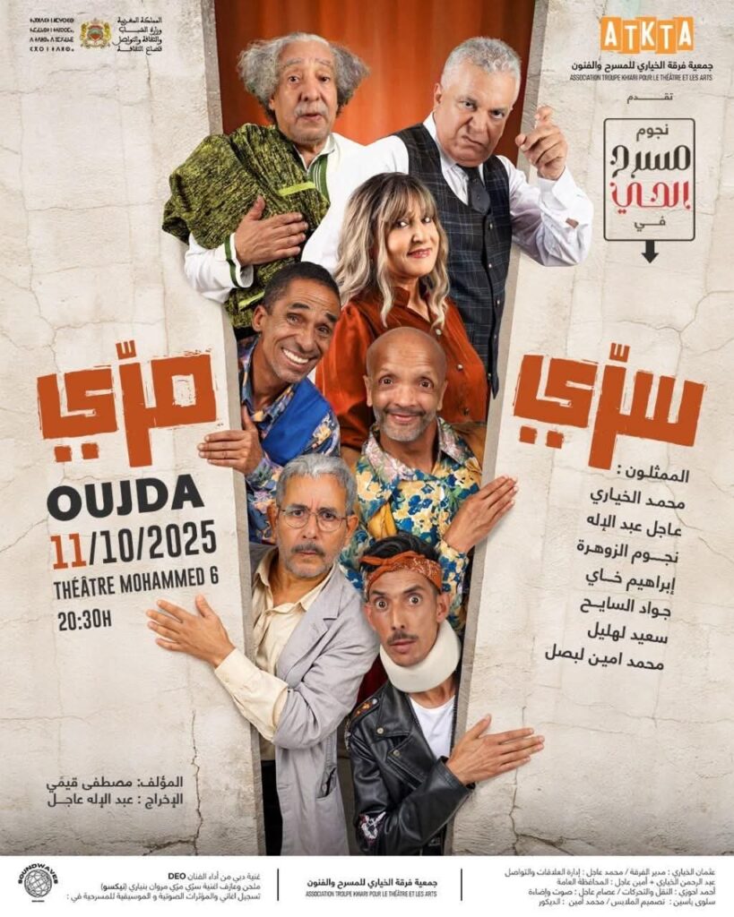 بوجدةتستعد جمعية فرقة الخياري للمسرح والفنون المتكونة من المع “نجوم مسرح الحي”، التي تضم فنانين بأسماء وازنة في الساحة الكوميدية المغربية، للقاء جمهورها بمسرح محمد السادس بوجدة، لتقدم لكم أحدث أعمالها المسرحية الكوميدية “سري مري”.جرعة مكثفة من الضحك والفرجة الراقية تنتظركم في عرض يعيد إحياء الزمن الجميل لـ”مسرح الحي” بروح عصرية.🗓️ التاريخ: الجمعة 11 أكتوبر 2025🕗 الزمان: الثامنة والنصف مساءً (20:30)📍 المكان: مسرح محمد السادس بوجدةللحجز وشراء التذاكر:📞 +212 600-595005