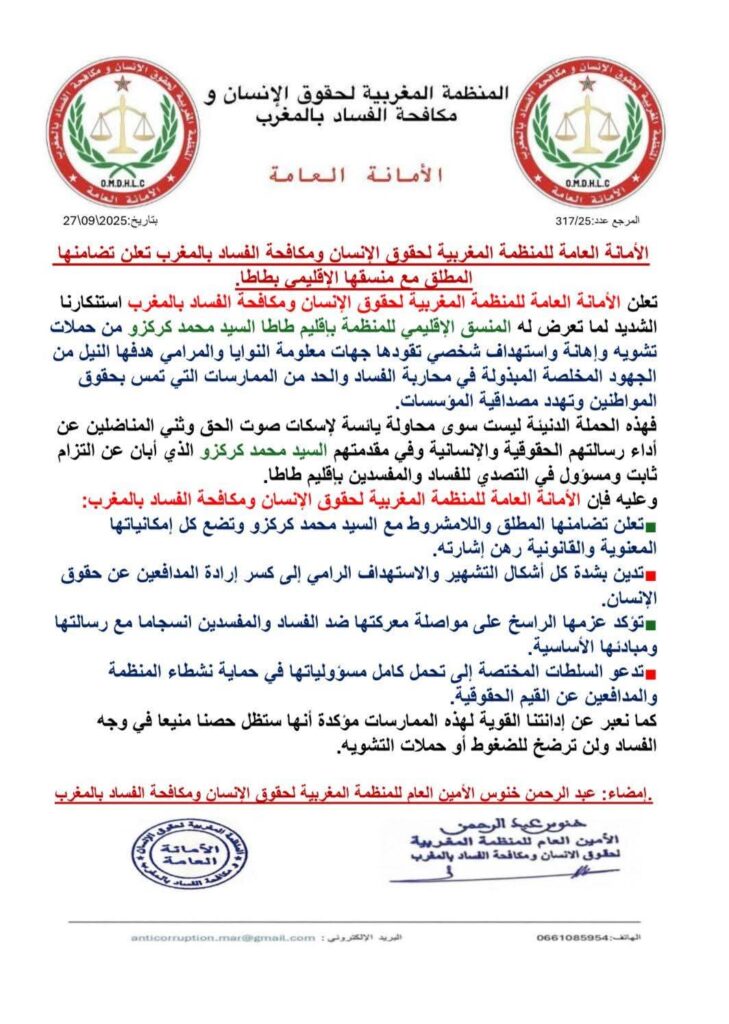 تعلن الأمانة العامة للمنظمة المغربية لحقوق الإنسان ومكافحة الفساد بالمغرب استنكارنا الشديد لما تعرض له المنسق الإقليمي للمنظمة بإقليم طاطا السيد محمد كركزو من حملات تشويه وإهانة واستهداف شخصي تقودها جهات معلومة النوايا والمرامي هدفها النيل من الجهود المخلصة المبذولة في محاربة الفساد والحد من الممارسات التي تمس بحقوق المواطنين وتهدد مصداقية المؤسسات.