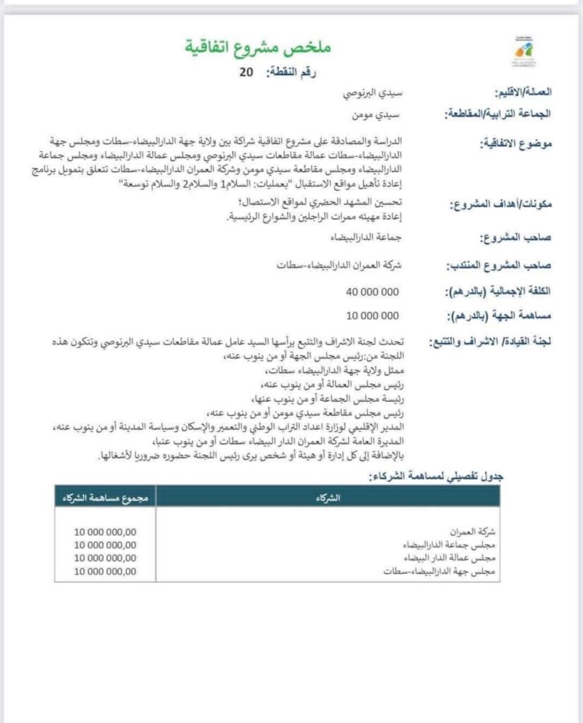 الاتفاقية المبرمة بين عدة شركاء مؤسساتيين (ولاية جهة الدار البيضاء-سطات، مجلس جماعة الدار البيضاء، مجلس عمالة الدار البيضاء، شركة العمران والتي ترصد غلافا ماليا قدره 40 مليون درهم جاءت لتضع حدا لهذه الوضعية. غير أن التأخر الكبير في تفعيلها يثير قلق الساكنة التي لم تعد قادرة على تحمل المزيد من الانتظار.