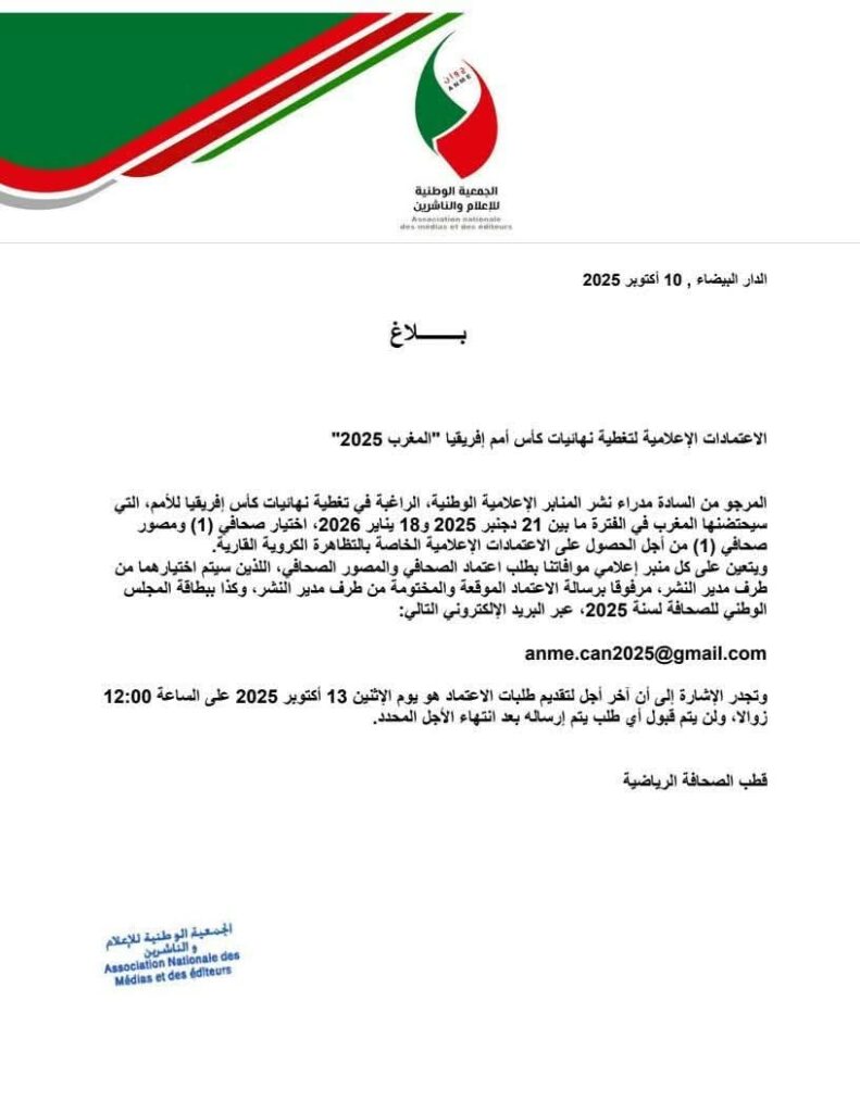 المرجو من السادة مدراء نشر المنابر الإعلامية الوطنية، الراغبة في تغطية نهائيات كأس إفريقيا للأمم، التي سيحتضنها المغرب في الفترة ما بين 21 دجنبر 2025 و18 يناير 2026، اختيار صحافي (1) ومصور صحافي (1) من أجل الحصول على الاعتمادات الإعلامية الخاصة بالتظاهرة الكروية القارية.