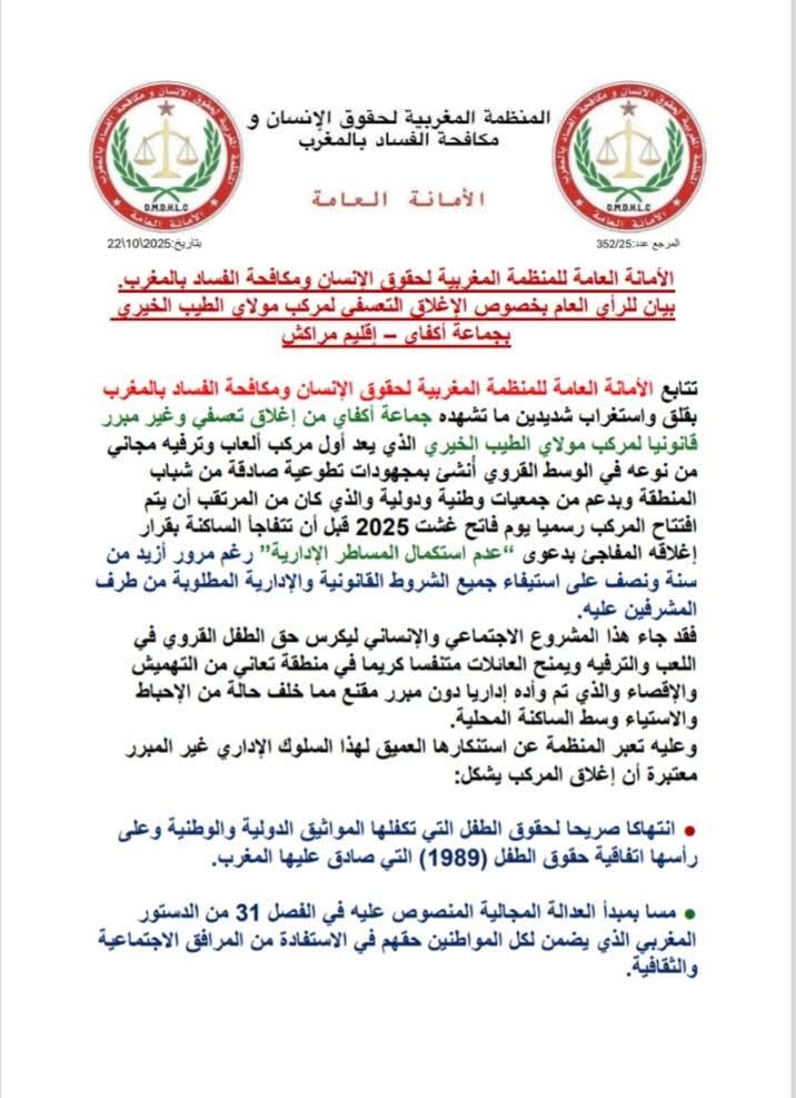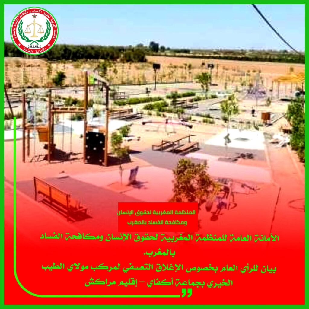 بيان للرأي العام بخصوص الإغلاق التعسفي لمركب مولاي الطيب الخيري بجماعة أكفاي – إقليم مراكش