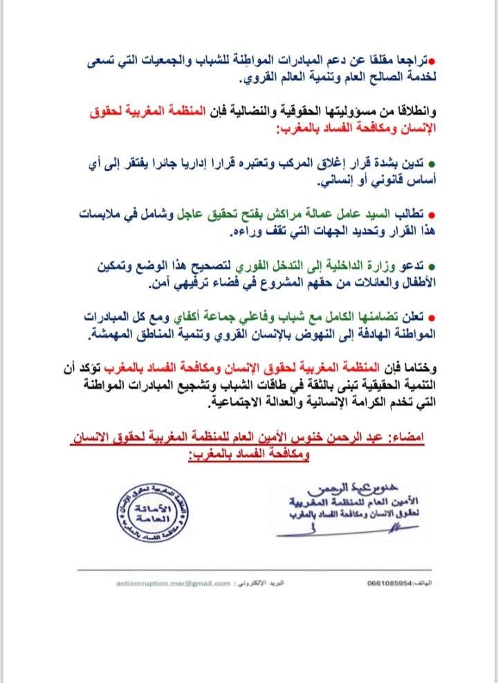 إمضاء: عبد الرحمن خنوس الأمين العام للمنظمة المغربية لحقوق الإنسان ومكافحة الفساد بالمغرب