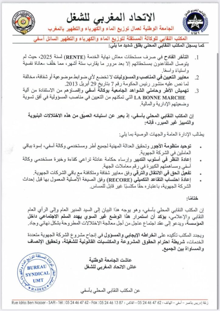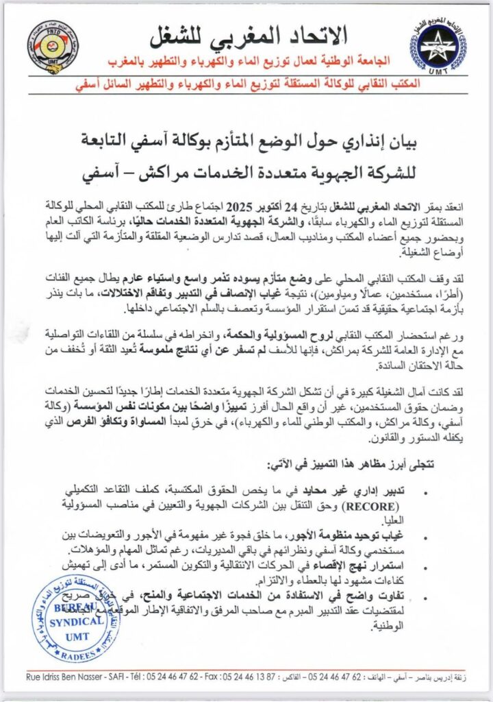 بعد الشكايات المتعددة والظلم الذي طال ساكنة اسفي وبعد خروج بعض رؤساء الجماعات اعلاميا ضد الخروقات التي ترتكبها الشركة متعددة الخدمات مراكش-اسفي التي يسيرها حزب الاصالة والمعاصرة بعد ان خرجت الساكنة تستنكر ممارسات الشركة لا سيما بعد تزويد بعض المناطق بالماء المالح على اساس ماء صالح للشرب ، اليوم خرج عمال الشركة انفسهم يشتكون في بيان انذاري من الاقصاء والتهميش الذي طالهم بعد ان اصبح قطاع الماء والكهرباء يسيره منتخبين وكأن لسان حالهم يقول : واش خاصنا نكونو من حزب الاصالة والمعاصرة باش ناخدو حقنا .