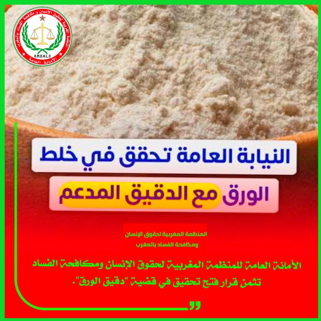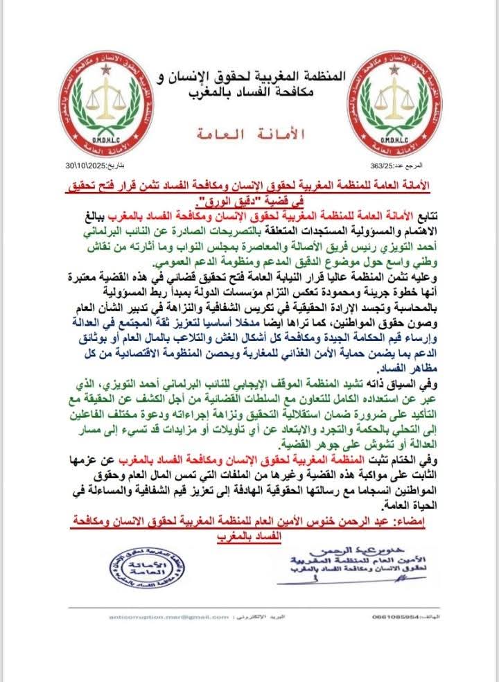 تتابع الأمانة العامة للمنظمة المغربية لحقوق الإنسان ومكافحة الفساد بالمغرب ببالغ الاهتمام والمسؤولية المستجدات المتعلقة بالتصريحات الصادرة عن النائب البرلماني أحمد التويزي رئيس فريق الأصالة والمعاصرة بمجلس النواب وما أثارته من نقاش وطني واسع حول موضوع الدقيق المدعم ومنظومة الدعم العمومي.