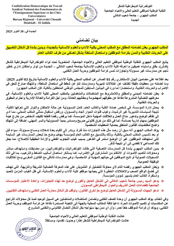 أعلن المكتب الجهوي للنقابة الوطنية لموظفي التعليم العالي والأحياء الجامعية، المنضوي تحت لواء الكونفدرالية الديمقراطية للشغل (كدش)، تضامنه المطلق مع المكتب المحلي بكلية الآداب والعلوم الإنسانية بجامعة شعيب الدكالي بالجديدة، معبرًا عن استنكاره لكل أشكال التضييق على الحريات النقابية، المسّ بكرامة الموظفين، واستعمال السلطة بشكل تعسفي من طرف الكاتب العام.