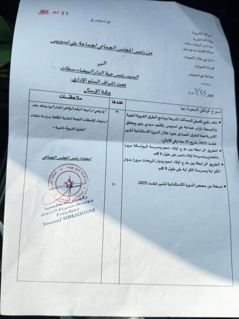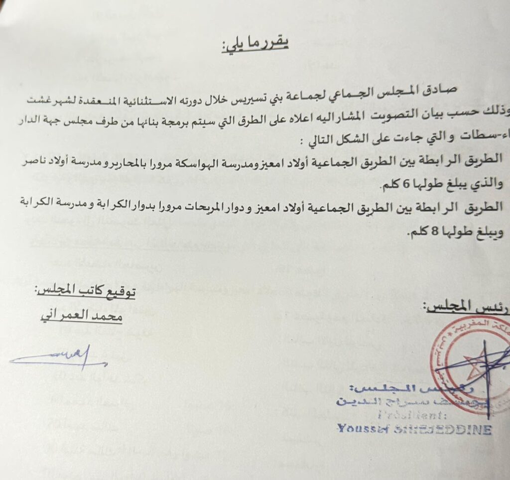 تشهد جماعة بني تسيريس توتراً جديداً داخل مجلسها الجماعي، بعدما رفض رئيس الجماعة تنفيذ مقرر المجلس المتعلق بتهيئة وإصلاح مجموعة من الطرق داخل النفوذ الترابي للجماعة، رغم المصادقة عليه بالأغلبية خلال الدورة الأخيرة.