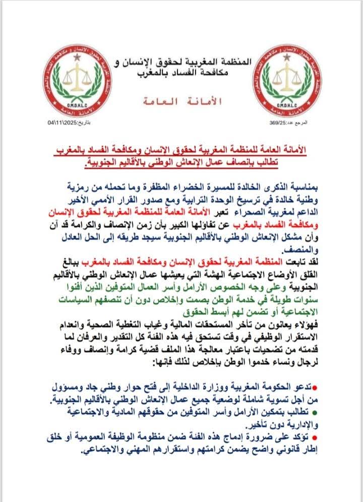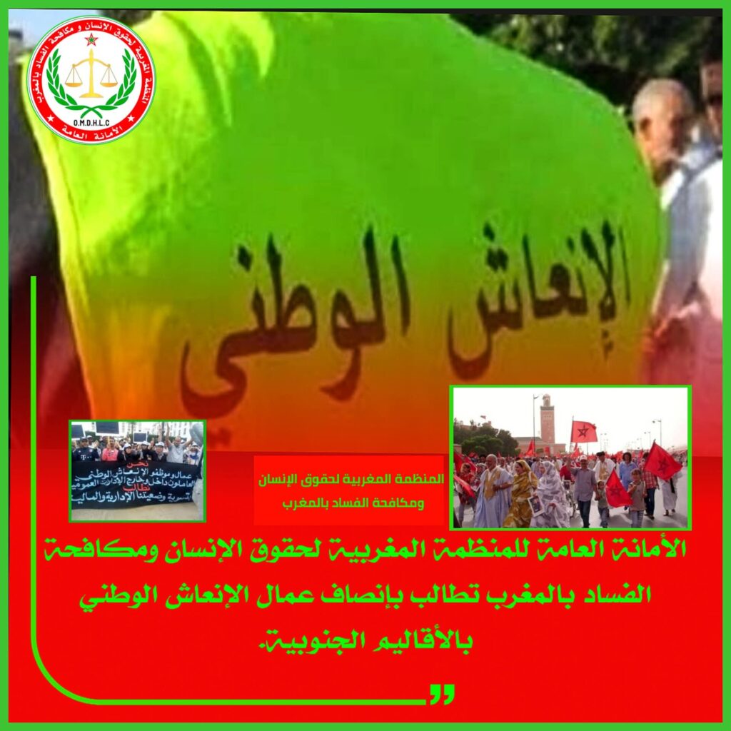 الأمانة العامة للمنظمة المغربية لحقوق الإنسان ومكافحة الفساد بالمغرب تطالب بإنصاف عمال الإنعاش الوطني بالأقاليم الجنوبية.