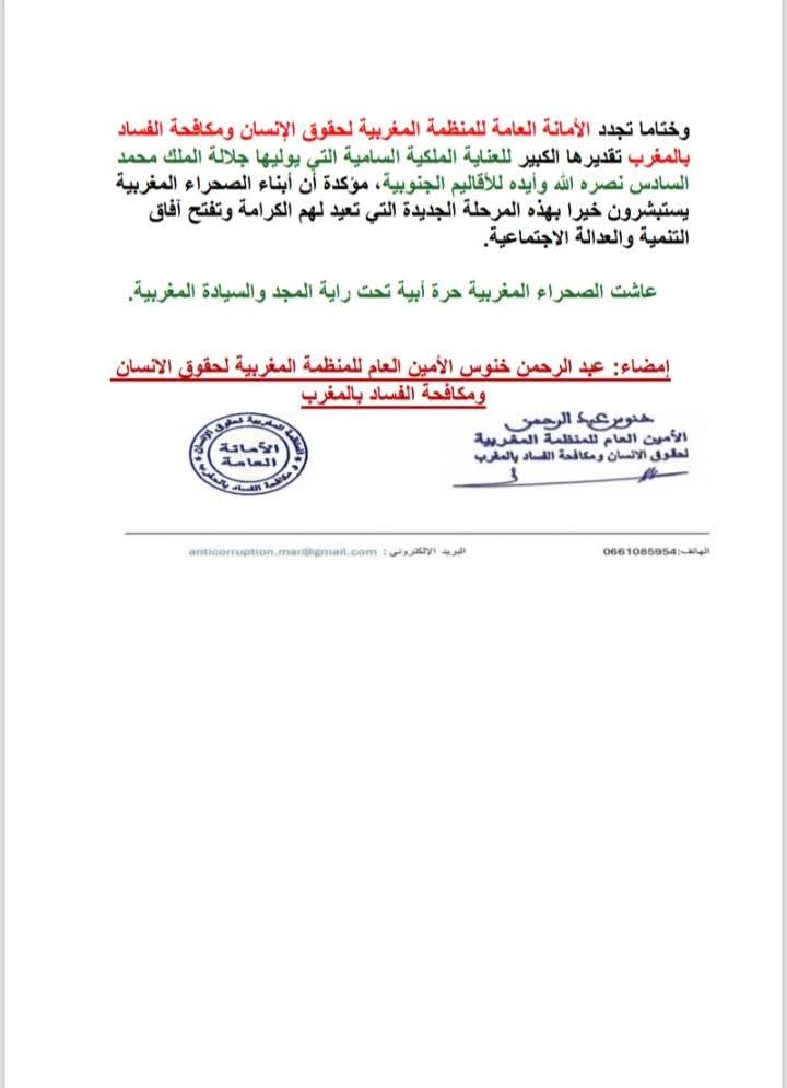 إمضاء: عبد الرحمن خنوس الأمين العام للمنظمة المغربية لحقوق الإنسان ومكافحة الفساد بالمغرب