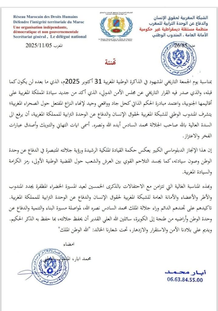 بمناسبة يوم الجمعة التاريخي المشهود في الذاكرة الوطنية المغربية 31 أكتوبر 2025، الذي ما بعده لن يكون كما قبله، والذي صدر فيه القرار التاريخي عن مجلس الأمن الدولي، الذي أكد من جديد سيادة المملكة المغربية على أقاليمها الجنوبية، واعتمد مبادرة الحكم الذاتي كحل جاد وواقعي ووحيد لإنهاء النزاع المفتعل حول الصحراء المغربية، يتشرف المندوب الوطني للشبكة المغربية لحقوق الإنسان والدفاع عن الوحدة الترابية للمملكة المغربية، أن يرفع إلى السدة العالية بالله صاحب الجلالة الملك محمد السادس أيده الله ونصره، أسمى آيات التهاني والتبريك، وأصدق عبارات الفخر والاعتزاز.