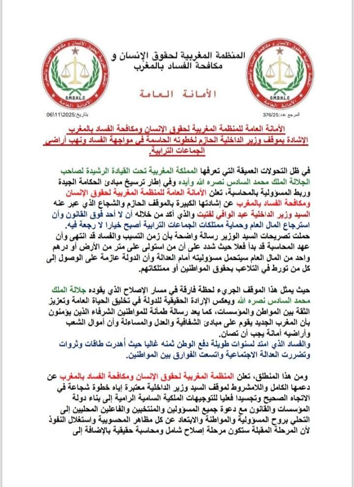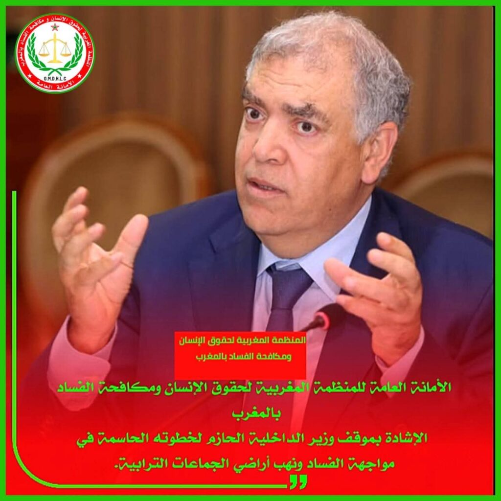 في ظل التحولات العميقة التي تعرفها المملكة المغربية تحت القيادة الرشيدة لصاحب الجلالة الملك محمد السادس نصره الله وأيده وفي إطار ترسيخ مبادئ الحكامة الجيدة وربط المسؤولية بالمحاسبة، تعلن الأمانة العامة للمنظمة المغربية لحقوق الإنسان ومكافحة الفساد بالمغرب عن إشادتها الكبيرة بالموقف الحازم والشجاع الذي عبر عنه السيد وزير الداخلية عبد الوافي لفتيت والذي أكد من خلاله أن لا أحد فوق القانون وأن استرجاع المال العام وحماية ممتلكات الجماعات الترابية أصبح خيارا لا رجعة فيه.