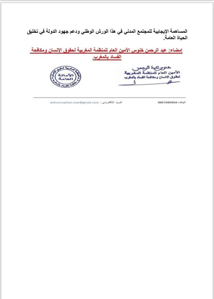 إمضاء: عبد الرحمن خنوس الأمين العام للمنظمة المغربية لحقوق الإنسان ومكافحة الفساد بالمغرب.