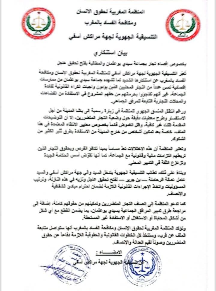 كما تدعو المنظمة إلى إنصاف التجار المتضررين وتمكينهم من حقوقهم كاملة، إضافة إلى مراجعة طرق تدبير المرافق الجماعية بسيدي بوعثمان، بما يضمن القطع مع أي شكل من أشكال المحاباة أو الاستغلال أو الاستفادة غير المستحقة.