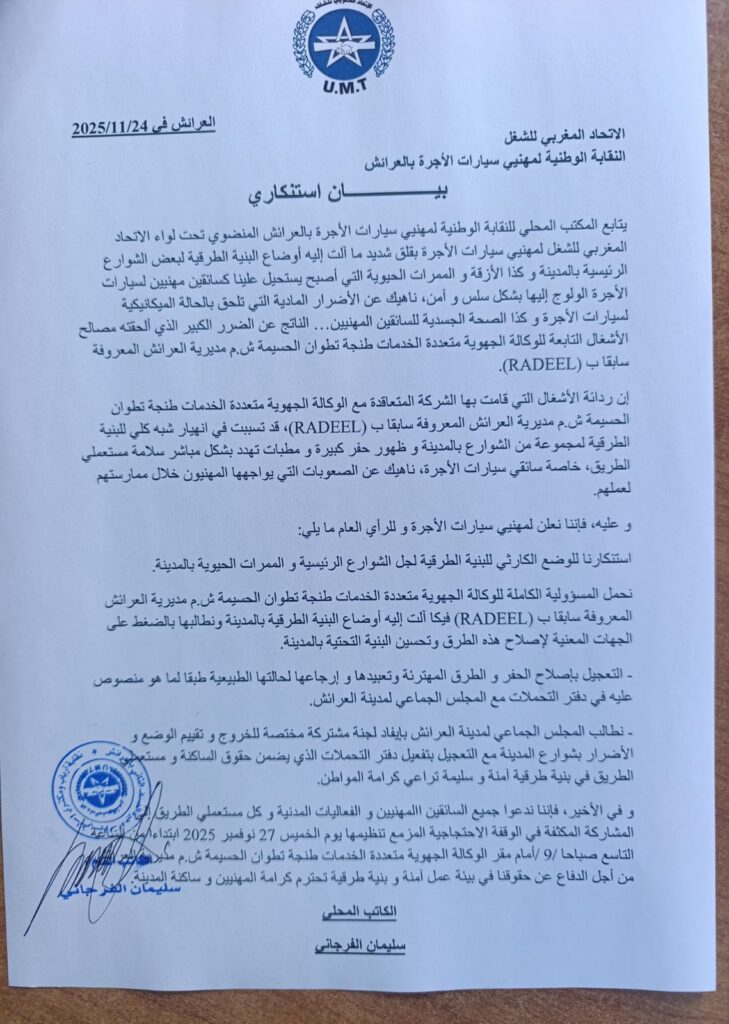 كما أعلنت النقابة الوطنية لمهنيي سيارات الأجرة بالعرائش عن تنظيم وقفة احتجاجية يوم الخميس 27 نونبر 2025 ابتداءً من الساعة التاسعة صباحاً أمام مقر الوكالة الجهوية متعددة الخدمات، وذلك للدفاع عن “الحق في بيئة عمل سليمة وبنية طرقية تليق بمدينة العرائش”.