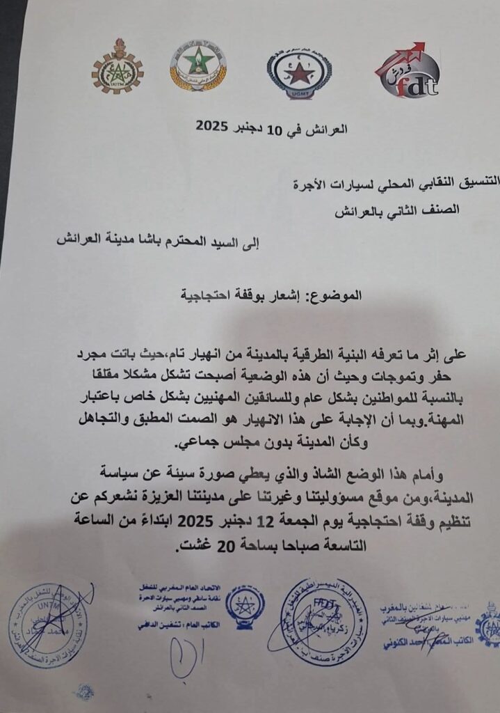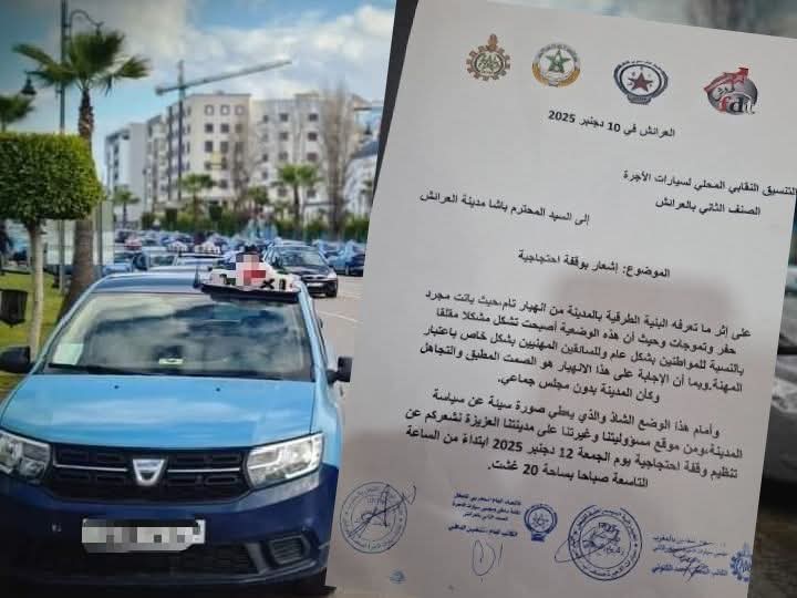 وفي ظل هذا الإهمال، أعلن التنسيق النقابي المحلي لسيارات الأجرة الصنف الثاني بالعرائش عن تنظيم وقفة احتجاجية يوم الجمعة 12 دجنبر 2025 بساحة 20 غشت، بمشاركة الإطارات النقابية التالية:
