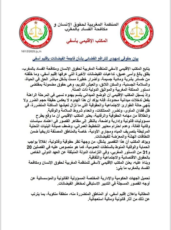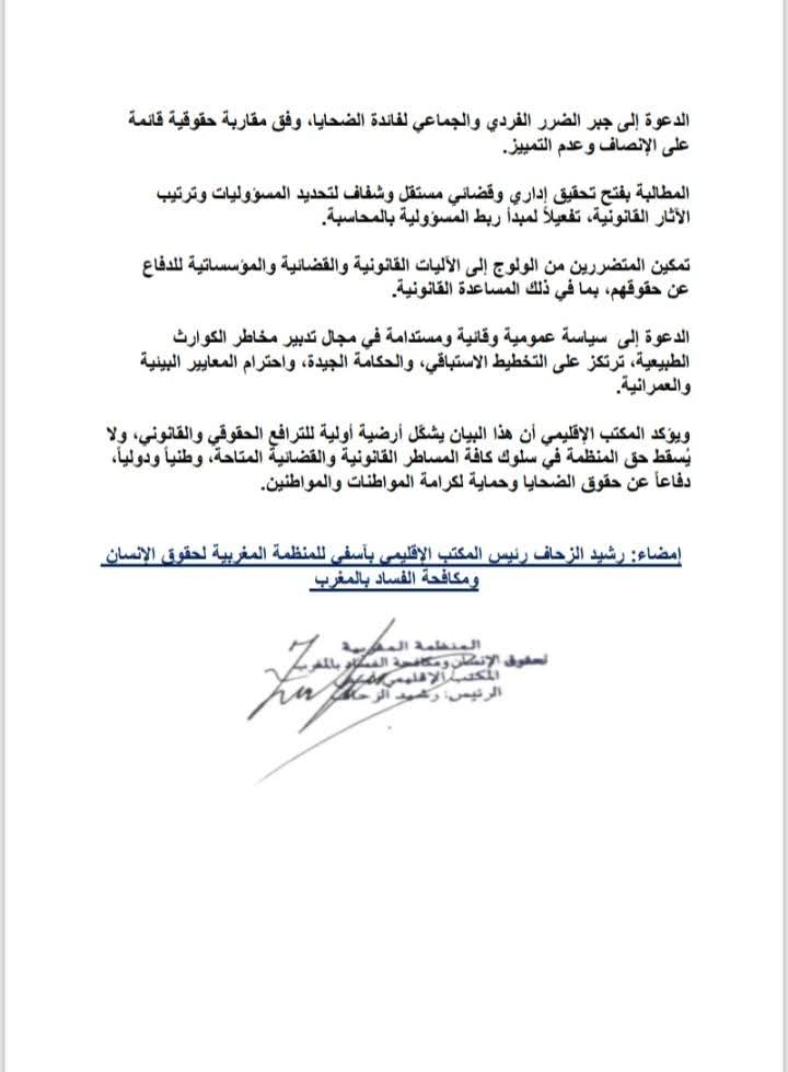 وانطلاقاً من مهامه الحقوقية والرقابية، يعتبر المكتب الإقليمي أن ما وقع يطرح مسؤوليات قانونية وإدارية واضحة، بالنظر إلى مظاهر القصور في اعتماد سياسات وقائية فعّالة، وعدم احترام معايير التخطيط العمراني، وضعف صيانة البنيات التحتية المرتبطة بتصريف المياه ومجاري الأودية، خاصة بالمناطق المصنّفة تاريخياً ضمن النطاقات الهشّة والمعرّضة للفيضانات.