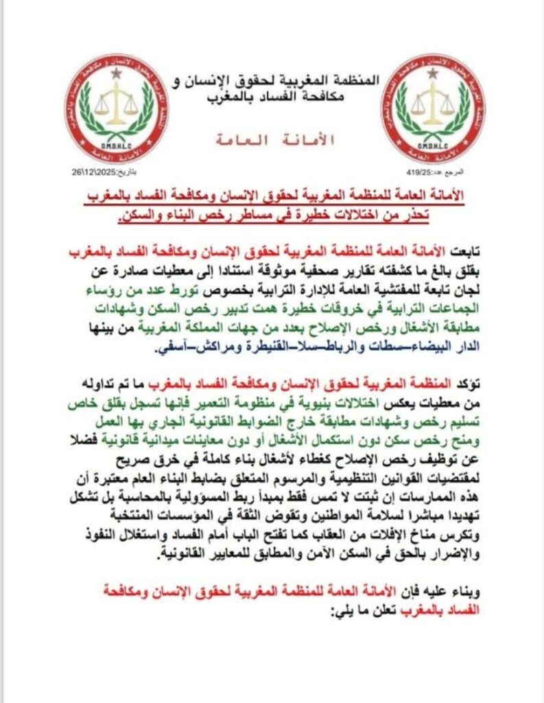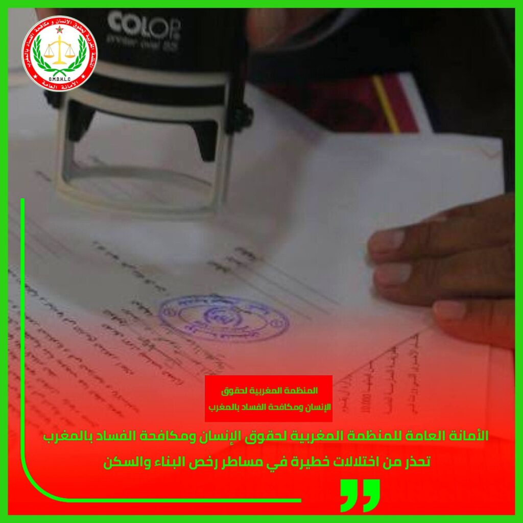 الأمانة العامة للمنظمة المغربية لحقوق الإنسان ومكافحة الفساد بالمغربتحذر من اختلالات خطيرة في مساطر رخص البناء والسكن.