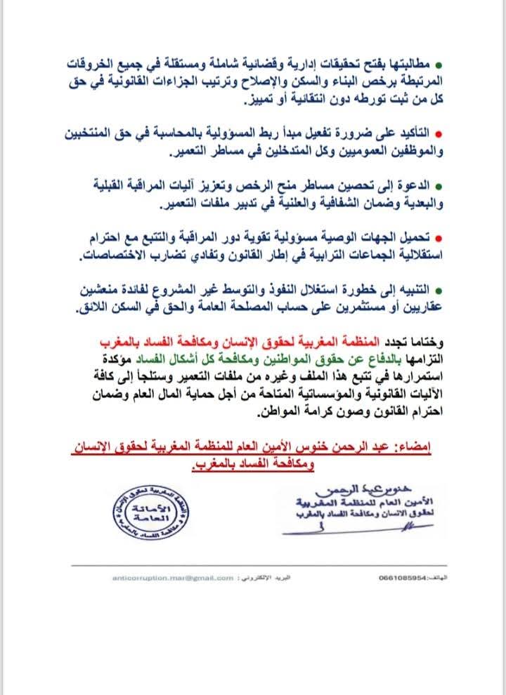 تؤكد المنظمة المغربية لحقوق الإنسان ومكافحة الفساد بالمغرب ما تم تداوله من معطيات يعكس اختلالات بنيوية في منظومة التعمير فإنها تسجل بقلق خاص تسليم رخص وشهادات مطابقة خارج الضوابط القانونية الجاري بها العمل ومنح رخص سكن دون استكمال الأشغال أو دون معاينات ميدانية قانونية فضلا عن توظيف رخص الإصلاح كغطاء لأشغال بناء كاملة في خرق صريح لمقتضيات القوانين التنظيمية والمرسوم المتعلق بضابط البناء العام معتبرة أن هذه الممارسات إن ثبتت لا تمس فقط بمبدأ ربط المسؤولية بالمحاسبة بل تشكل تهديدا مباشرا لسلامة المواطنين وتقوض الثقة في المؤسسات المنتخبة وتكرس مناخ الإفلات من العقاب كما تفتح الباب أمام الفساد واستغلال النفوذ والإضرار بالحق في السكن الآمن والمطابق للمعايير القانونية.