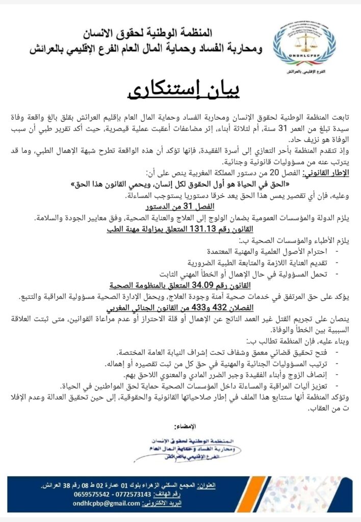 تابعت المنظمة الوطنية لحقوق الإنسان ومحاربة الفساد وحماية المال العام بإقليم العرائش بقلق بالغ واقعة وفاة سيدة تبلغ من العمر 31 سنة، أم لثلاثة أبناء، إثر مضاعفات أعقبت عملية قيصرية، حيث أكد تقرير طبي أن سبب الوفاة هو نزيف حاد.