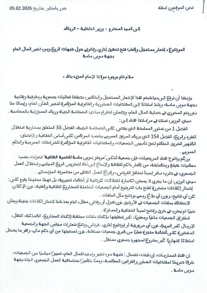 ووفق المعطيات الواردة في الوثيقة، فإن جمعية تُدعى “مركز سوس ماسة للتنمية الثقافية” أصبحت محط تساؤلات متزايدة من طرف فاعلين جمعويين، بسبب ما اعتبروه غيابًا للوضوح في الإعلان عن نتائج طلبات المشاريع الثقافية، وتكرار فتح باب الترشيح دون تقديم توضيحات بخصوص مآل الملفات السابقة.