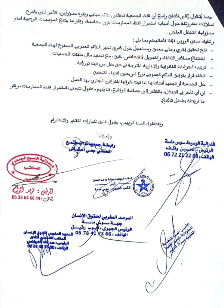 وقد حملت المراسلة توقيع عدد من الإطارات، من بينها فدرالية الوسيط سوس ماسة، فيدرالية النسيج الجمعوي، رابطة جمعيات المجتمع المدني بحي أحشاش، النقابة المهنية لحماية ودعم الفنان، المرصد المغربي لحقوق الإنسان، النقابة المغربية للمهن الفنية، والمعهد المغربي لحقوق الإنسان.