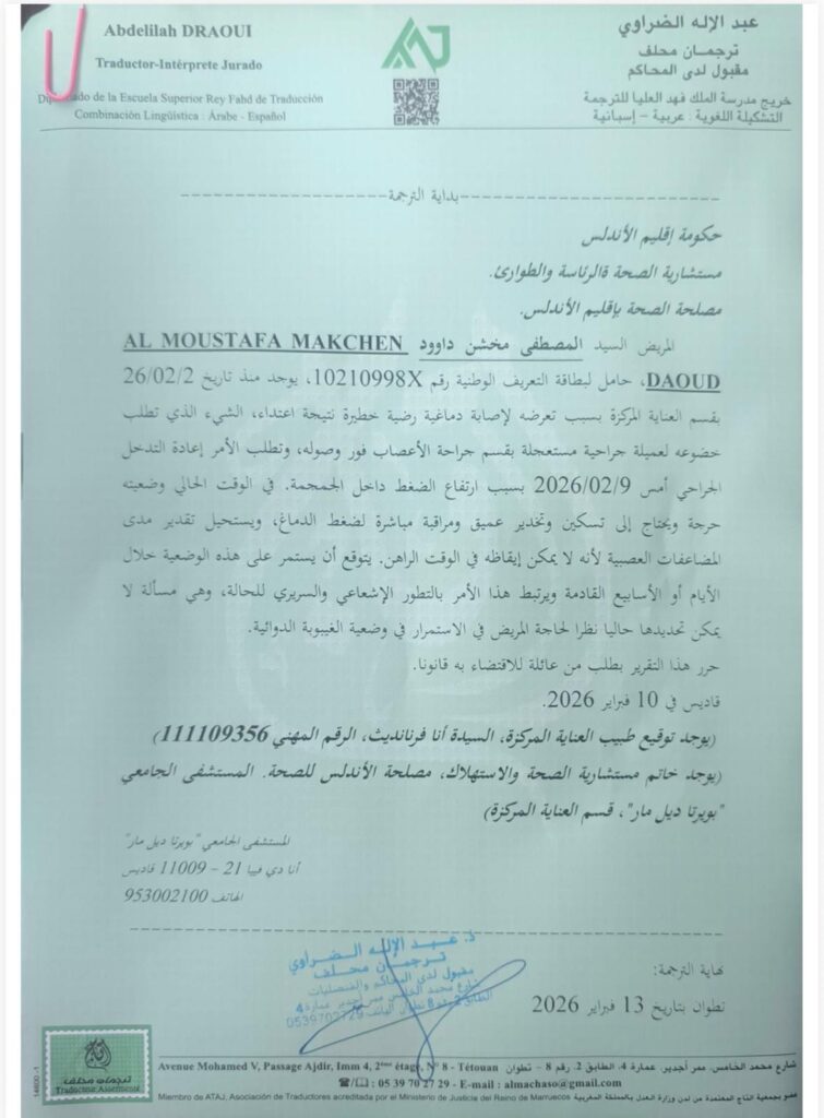 وقد تم نقله يوم 2 فبراير 2026 بشكل مستعجل لتلقي العلاجات الضرورية، حيث كشفت الفحوصات الطبية عن إصابة خطيرة على مستوى الرأس ونزيف دماغي استدعى تدخلاً طبياً عاجلاً.
